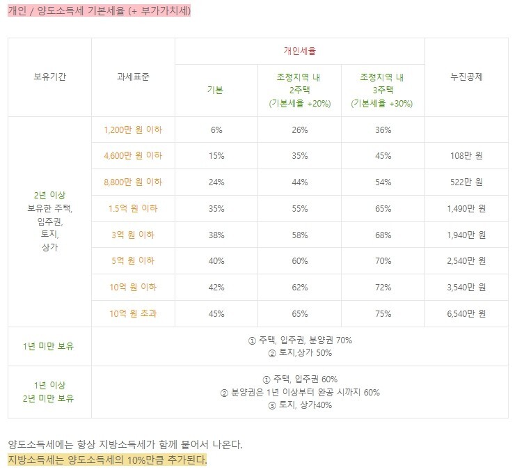 ※ 부동산 매매업일 경우 양도세가 아닌 사업소득세,법인은 법인세가 부과된다.